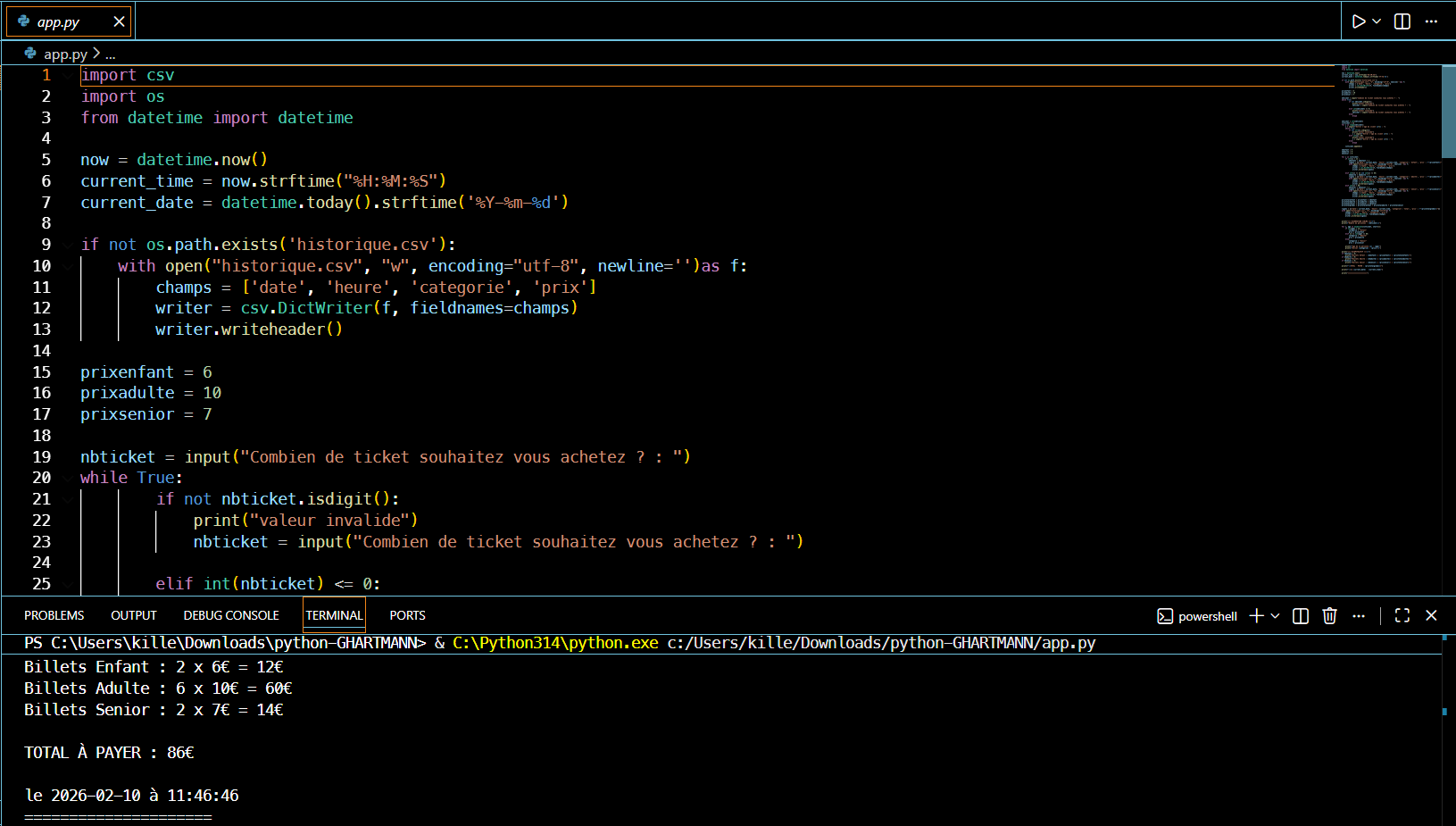 Application console développée en Python permettant de gérer la réservation de billets de cinéma avec calcul automatique des tarifs et historique des ventes. Projet réalisé dans le cadre d’une évaluation de compétences.